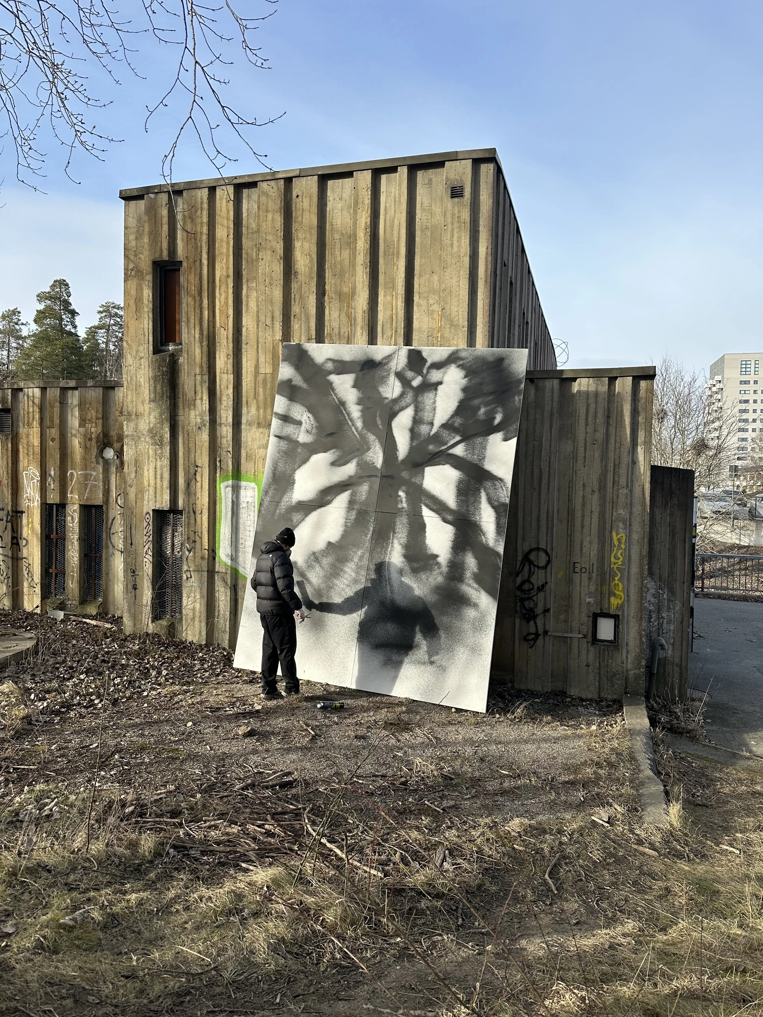 I verket som skapades för En dag på Kummelholmen #3 dominerar svart sprayfärg i svepande rörelser över en storskalig duk. Ytan bär spår av handling – stänk, drag och rytmiska avbrott – där målningen fungerar både som en registrering av rörelse och en aktiv närvaro i rummet.