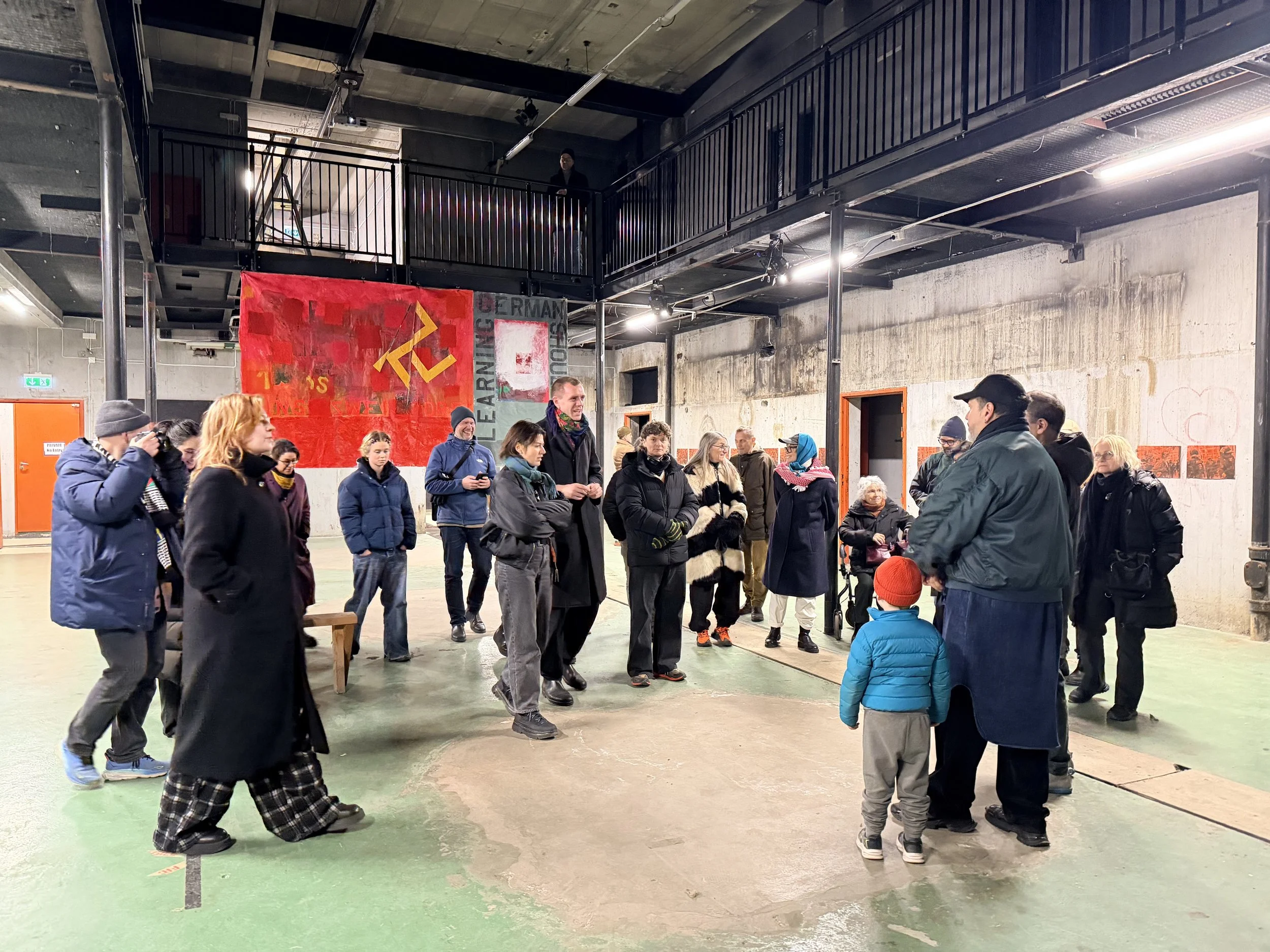 En större textil hänger i rummet som en central bildyta – ett lager där tecken, färg och gest överlagrar dokumentationen. Den fungerar inte som illustration utan som en förskjutning: något som bryter bildflödet och samtidigt binder det samman.