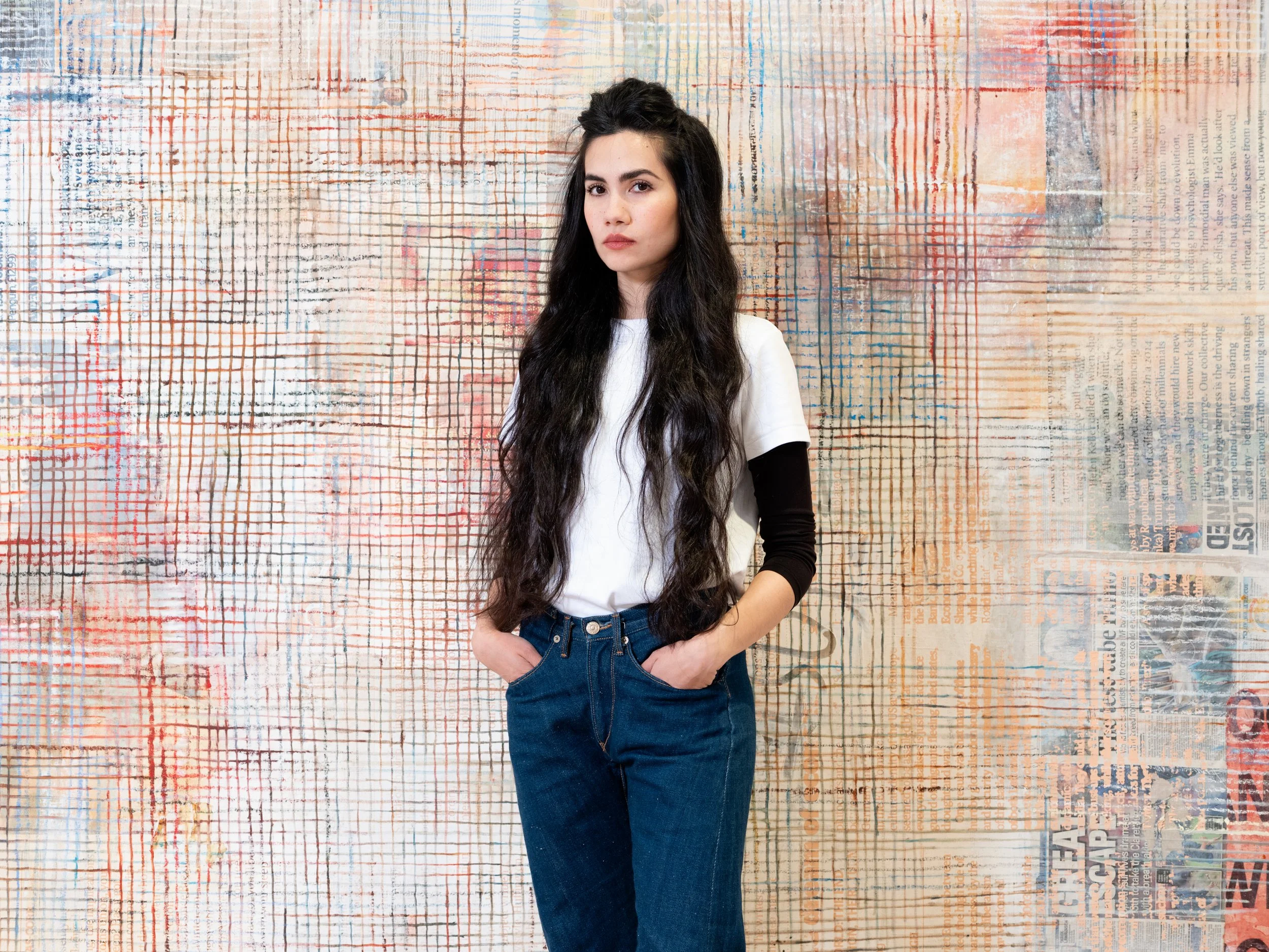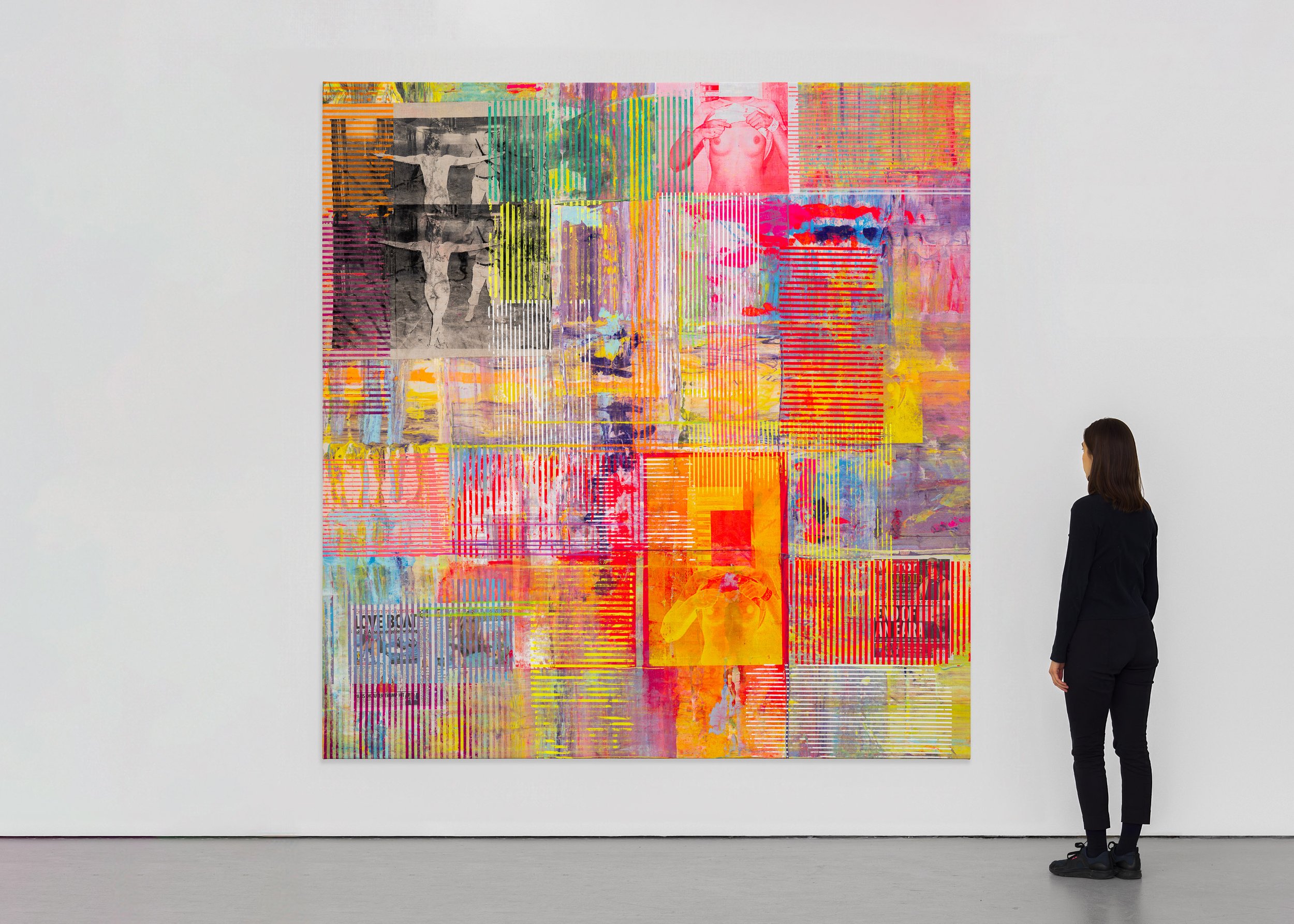 Alongside their distressing content, the images chosen by El-Sayegh also possess qualities of aesthetic beauty, with some resembling erotica, or even religious iconography. El-Sayegh is drawn to this tension, and to the possibilities for rewriting the codes which govern how we receive imagery – the potential for painterly abstraction to confer renewed dignity, or allow transcendence to subjects under force or coercion. El-Sayegh embeds repeated silkscreened renderings of the photographs into her densely layered canvases, which use physical collaged fragments in combination with acrylic and oil paint, in compositions that consciously evoke the gridded forms of modernist abstraction.