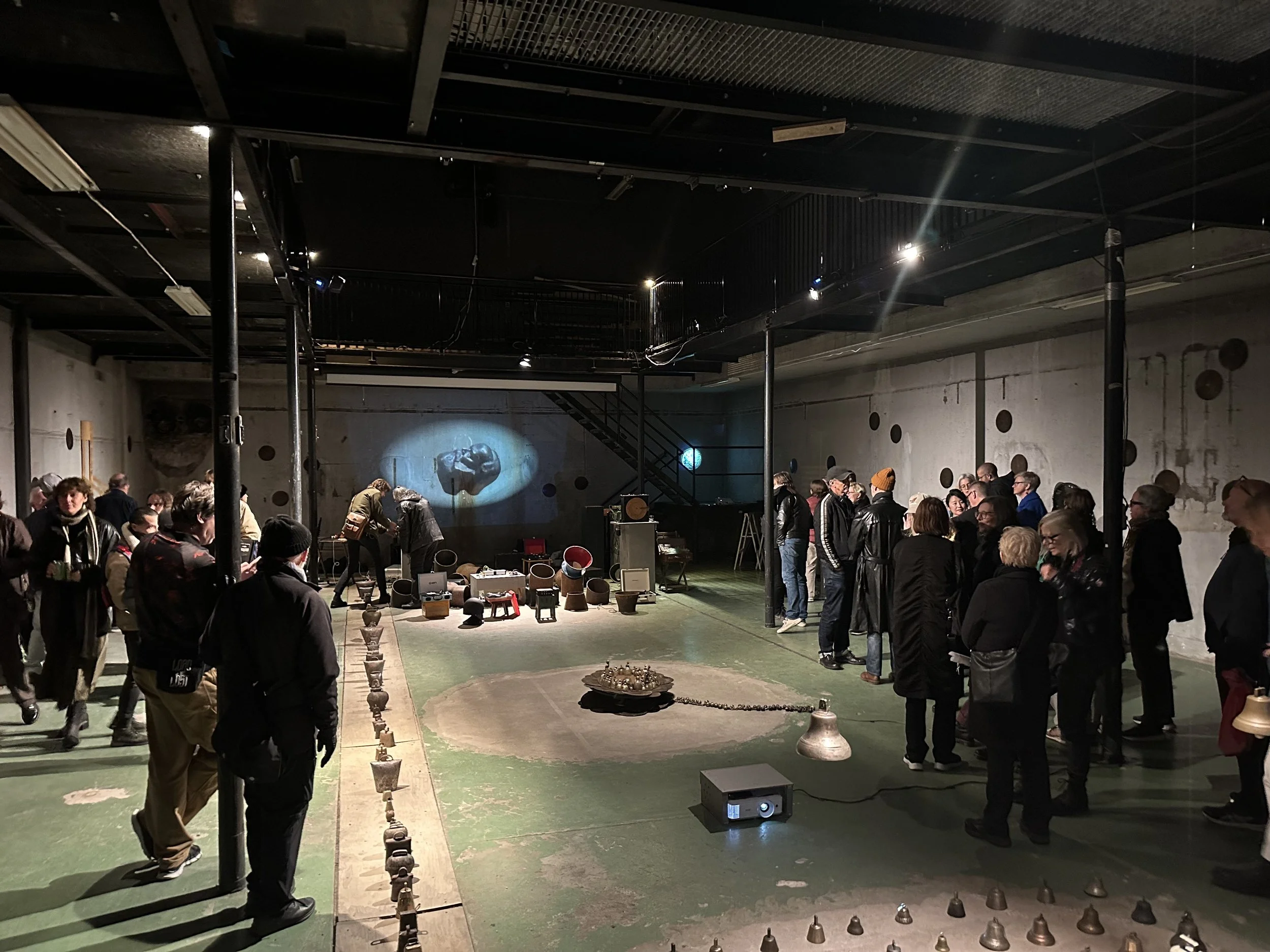 En utställning där ljud, ljus och mekanik sammanförs i ett tätat rum av rörelse, friktion och motstånd.